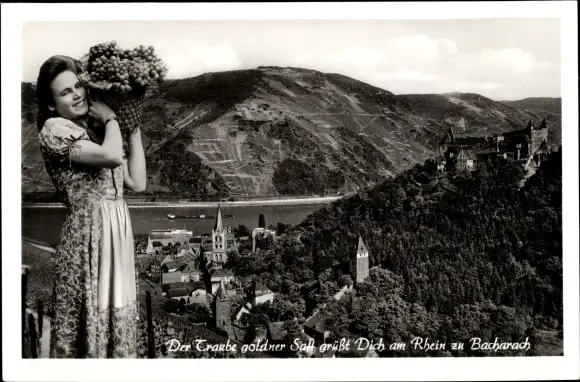 Ak Bacharach am Rhein, Teilansicht, Frau mit Traubenkorb, Burg