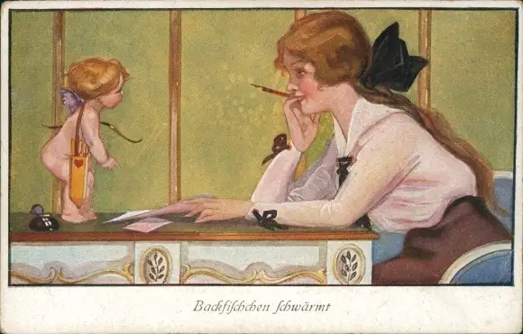 Ak Backfischchen schwärmt, junfe Frau, Amor