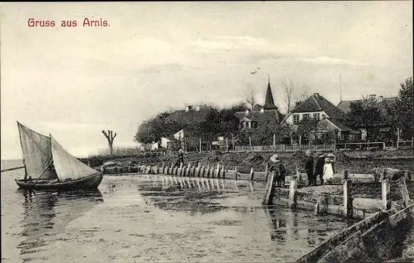 Ak Bad Arnis an der Schlei, Uferpartie, Segelboot
