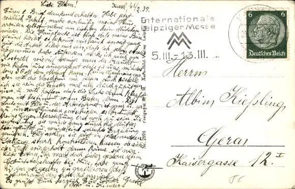 Zustand siehe Scan, 1939, gelaufen - ca 14 cm X 9 cm