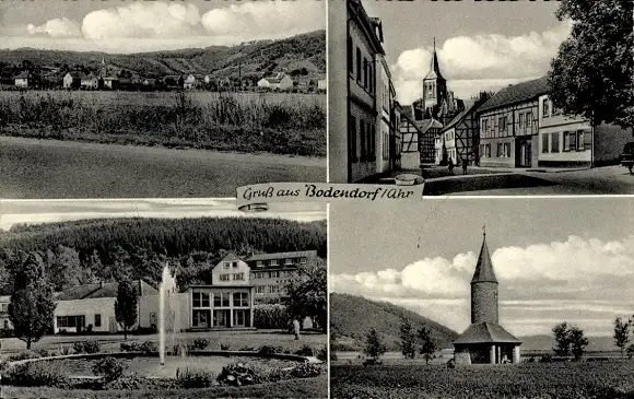 Ak Bad Bodendorf Sinzig am Rhein, Gesamtansicht, Fachwerkhäuser, Kirche, Springbrunnen, Kapelle