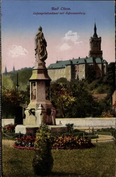 Ak Bad Cleve Kleve am Niederrhein, Lohengrindenkmal mit Schwanenburg