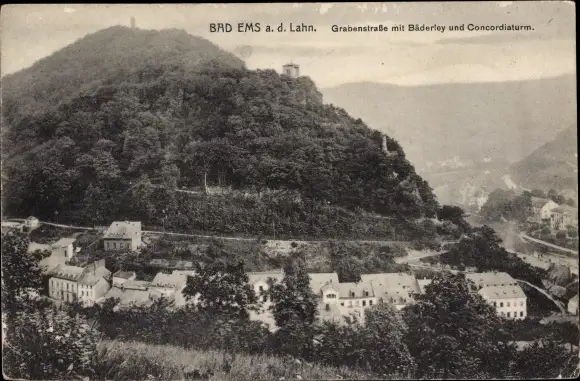 Ak Bad Ems an der Lahn, Grabenstraße mit Bäderley und Concorditurm