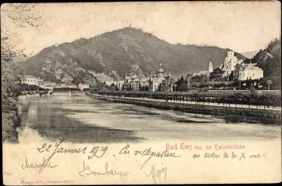 Ak Bad Ems an der Lahn, Kaiserbrücke, Totalansicht