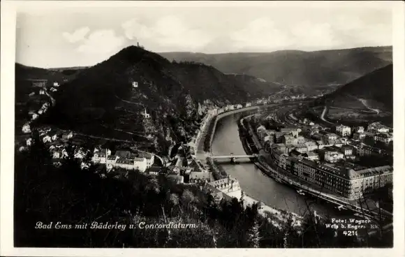 Ak Bad Ems an der Lahn, Totalansicht, Bäderley, Concordiaturm