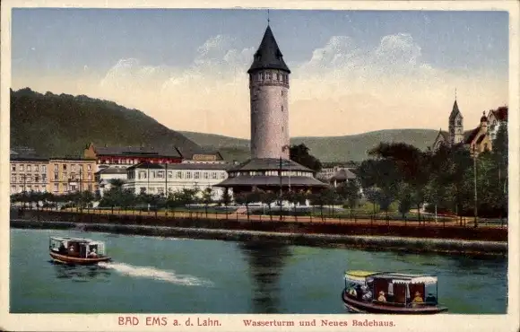 Ak Bad Ems an der Lahn, Wasserturm und neues Badehaus, Boote