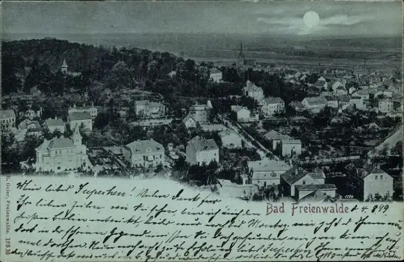 Ak Bad Freienwalde an der Oder, Luftaufnahme Häuser, Bäume, Mondschein
