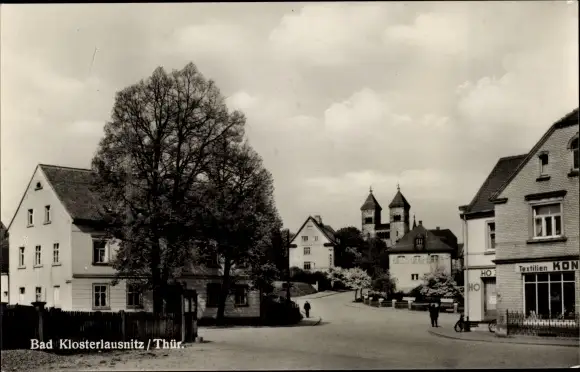 Ak Bad Klosterlausnitz in Thüringen, Straßenpartie in Ortschaft, Textilien Konsum, HO