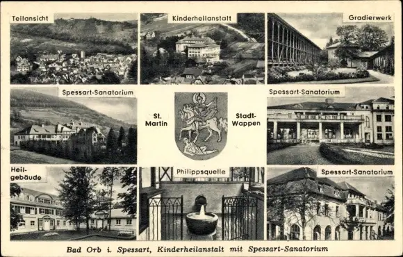 Ak Bad Orb im Spessart, Kinderheilanstalt, Spessart Sanatorium, Gradierwerk, Philippsquelle, Wappen