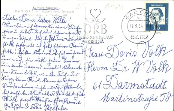 Zustand, siehe Scan, gelaufen, 1964- Inh. Fam. Tonowski - ca 14 cm X 9 cm