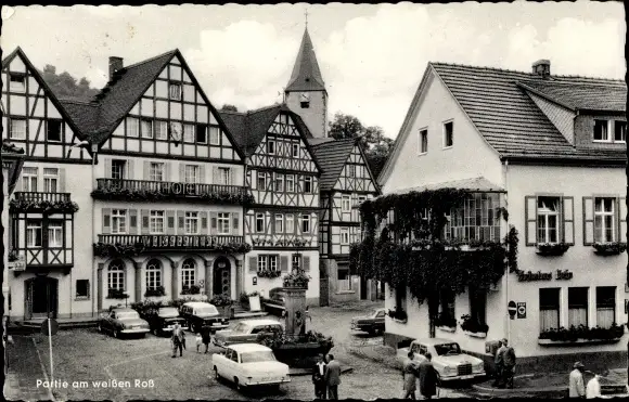 Ak Bad Orb in Hessen, Partie am weißen Ross, Mercedes Benz W 114, Fachwerkhäuser, Kirche