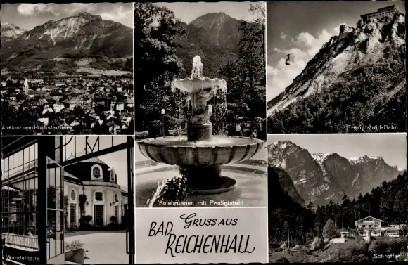 Ak Bad Reichenhall in Oberbayern, Solebrunnen, Schroffen, Predigtstuhlbahn, Wandelhalle