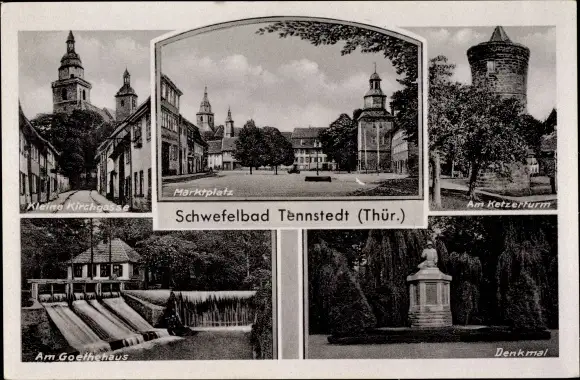 Ak Bad Tennstedt in Thüringen, Marktplatz, Ketzerturm, Kleine Kirchgasse, Goethehaus, Denkmal