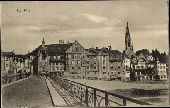 Ak Bad Tölz in Oberbayern, Ortsansicht von der Brücke, Kirche