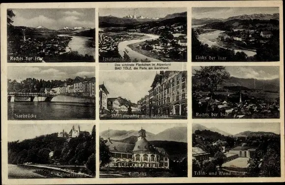 Ak Bad Tölz in Oberbayern, Straßenpartie, Rathaus, Kurhaus, Isarbrücke, Kalvarienberg