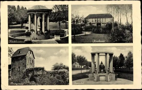 Ak Bad Vilbel in Hessen, Burgruine, Sprudel, Kurhaus, Trinkbrunnen