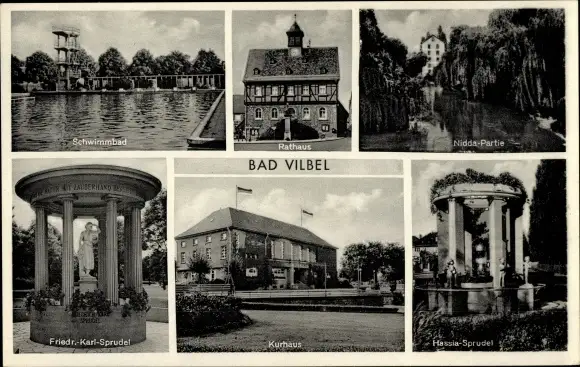 Ak Bad Vilbel in Hessen, Rathaus, Hassia Sprudel, Kurhaus, Schwimmbad