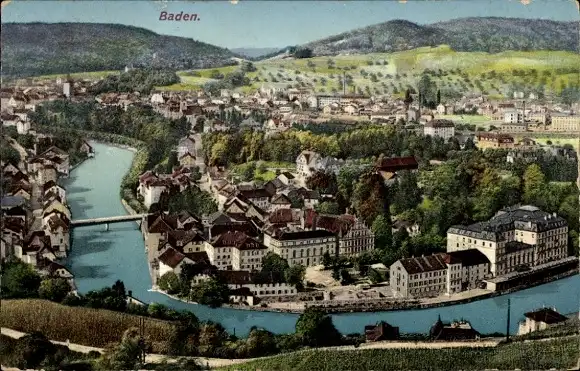 Ak Baden Aargau Schweiz, Gesamtansicht der Stadt, Brücke, Fluss