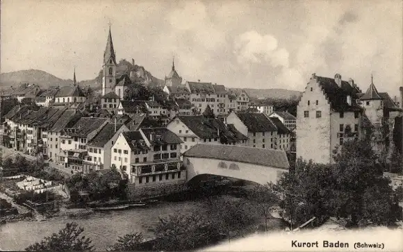 Ak Baden Kanton Aargau Schweiz, Stadtansicht, überdachte Brücke