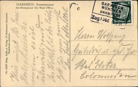 Ak Bahnpoststempel Garmisch-München Zug 1366