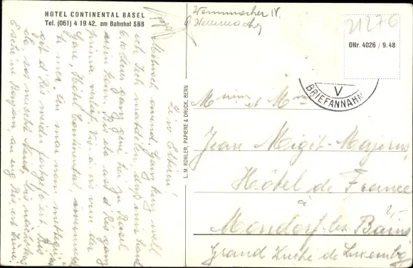 Ak Bâle Basel Stadt Schweiz, Hotel Continental