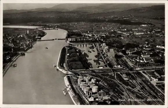 Ak Bâle Basel Stadt Schweiz, Kleinhüninger Rheinhafen, Fliegeraufnahme