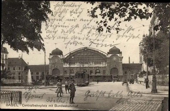 Ak Bâle Basel Stadt Schweiz, Zentralbahnplatz mit Bundesbahnhof, Straßenbahn