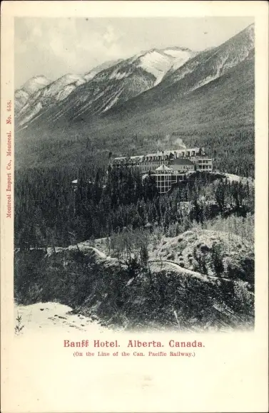 Ak Banff Alberta Canada, Banff Hotel, On the Line of the Can. Pacific Railway, Bergpanorama, Gebäude
