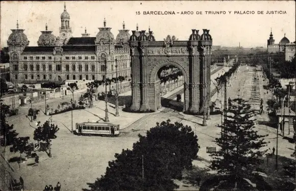 Ak Barcelona Katalonien, Arco de Triunfo y Palacio de Justicia, Straßenbahn. Torbogen
