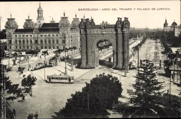 Ak Barcelona Katalonien Spanien, Arco de Triunfo y Palacio de Justicia, Straßenbahn, Torbogen