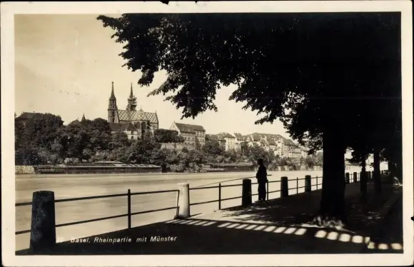 Ak Basel Bâle Stadt Schweiz, Rheinpartie mit Münster