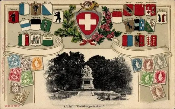 Ak Basel Bâle Stadt Schweiz, Wappen der Kantone der Schweiz, Strassburgerdenkmal in Basel