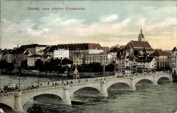 Ak Basel Bâle Stadt Schweiz, mittlere Rheinbrücke zur Stadt
