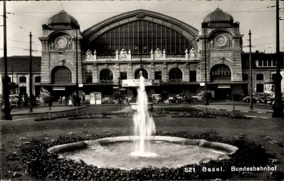 Ak Basel Stadt Schweiz, Bundesbahnhof, Springbrunnen