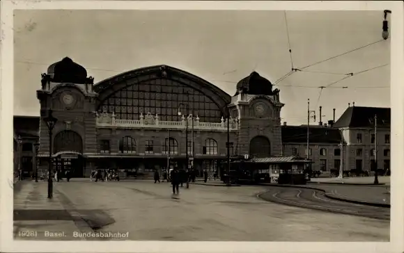 Ak Basel Stadt Schweiz, Bundesbahnhof, Springbrunnen