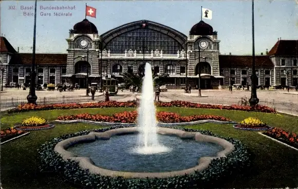 Ak Basel Stadt Schweiz, Bundesbahnhof, Wasserfontäne