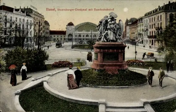 Ak Basel Stadt Schweiz, Strassburger-Denkmal mit Bundesbahnhof