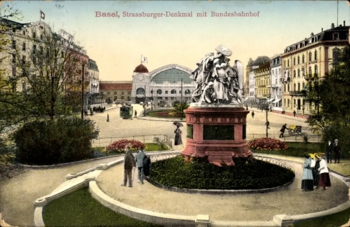 Ak Basel Stadt Schweiz, Strassburger Denkmal mit Bundesbahnhof