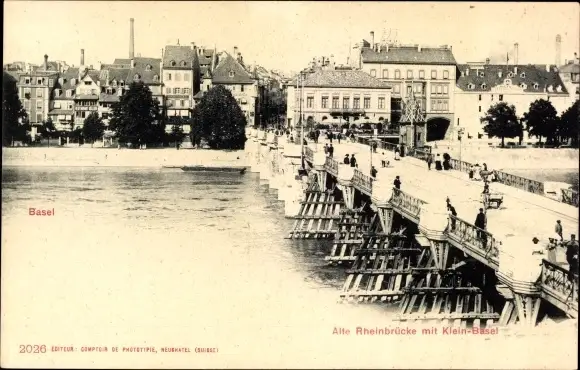 Ak Basel Stadt, alte Rheinbrücke mit Klein Basel