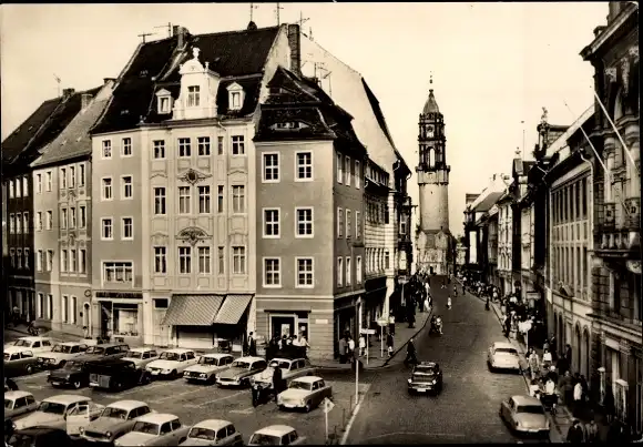 Ak Bautzen in der Oberlausitz, Reichenturm mit Reichenstraße, Autos