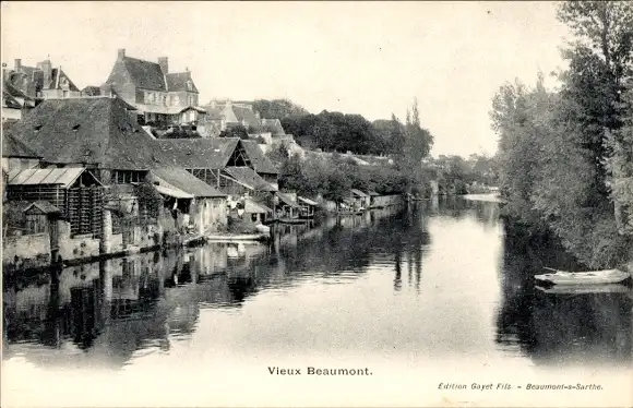 Ak Beaumont sur Sarthe, Altstadt, Häuser am Fluss