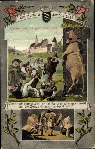 Ak Beckum in Westfalen, Oh sancta simplicitas, Männer hängen Kuh auf