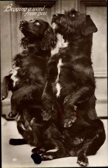 Ak Begging a word from you, zwei Hunde machen Männchen