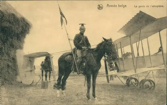 Ak Belgische Armee, Ulan, Wachposten, Militärflugzeug, I WK