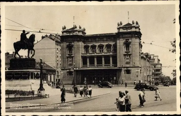 Ak Belgrad Beograd Serbien, Narodno pozoriste i spomenik, Nationaltheater, Reiterdenkmal