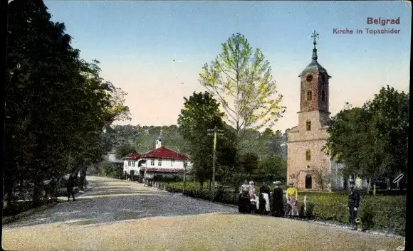 Ak Belgrad Serbien, Kirche in Topschider, Passanten