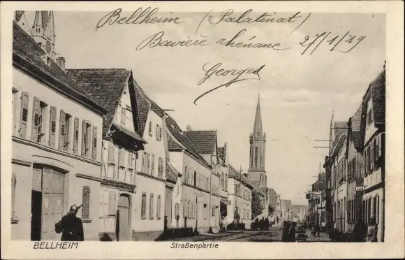 Ak Bellheim in der Pfalz, Straßenpartie, Kirche