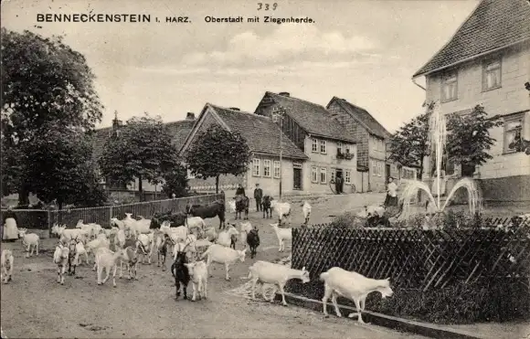 Ak Benneckenstein Oberharz, Oberstadt mit Ziegenherde, Springbrunnen