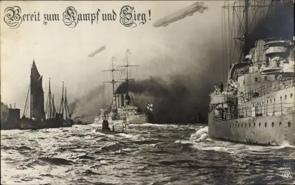 Ak Bereit zum Kampf und Sieg, deutsche Kriegsschiffe, U-Boote, Zeppeline, Kaiserliche Marine