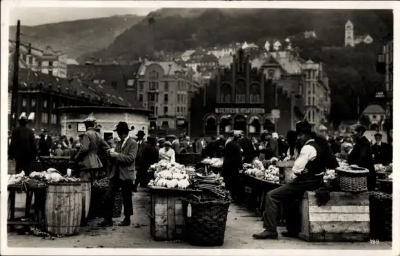 Ak Bergen Norwegen, Fischmarkt, Marktstände